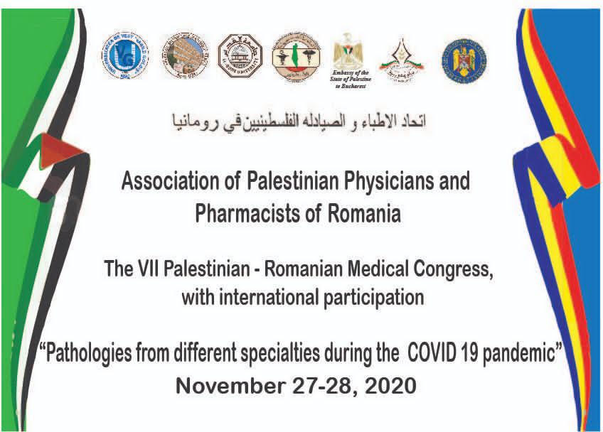 Asociaţia Medicilor şi Farmaciştilor Palestinieni din România, în parteneriat cu Ambasada Palestinei, Al Quds University, Departamentul Situaţii de Urgenţă, Universitatea de Vest “Vasile Goldiş“ din Arad, Spitalul Municipal Râmnicul Sărat şi Gaza University, va organiza, on line, în perioada 27-28 Noiembrie 2020, cel de-al Vll – lea Congres Medical Palestiniano – Român, , cu paticipare internaţională