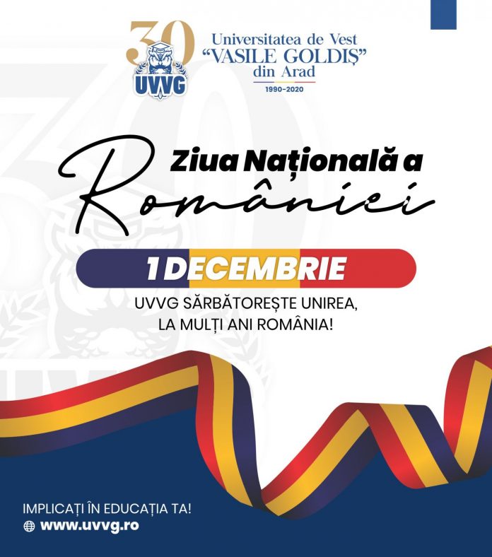Cu prilejul Zilei Naţionale a României, comunitatea academică a Universităţii de Vest „Vasile Goldiş” din Arad aduce un omagiu celui căruia îi datorăm cel mai important act din istoria postmodernă a României: formarea statului unitar român. Pentru noi, Ziua de 1 Decembrie este o zi sfântă, când s-a născut România Mare.