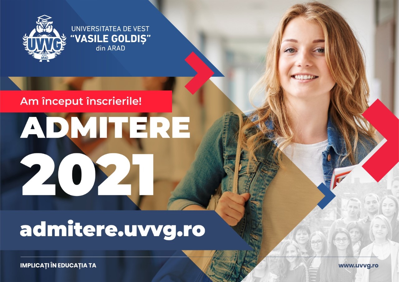 Înscrierea candidaților se desfășoară utilizând platforma de înscriere ONLINE pusă la dispoziție de Universitatea de Vest ,,Vasile Goldiş” din Arad la adresa de web: admitere.uvvg.ro de pe orice dispozitiv de tip calculator desktop, laptop, tabletă, telefon mobil cu acces la rețeaua de internet. Informaţii suplimentare se pot obţine la tel: 0748 988 884; e-mail: admitere@uvvg.ro sau site: http://www.uvvg.ro; Platforma online de admitere: admitere.uvvg.ro; Facebook: Universitatea de Vest ,,Vasile Goldiş” din Arad.