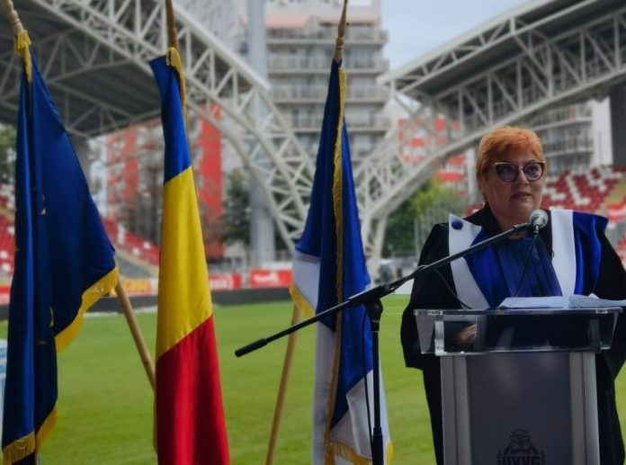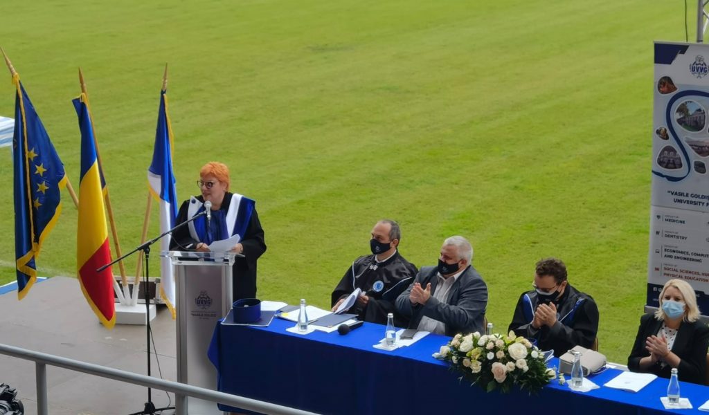 După vizionarea unui film În Memoriam Aurel Ardelean şi mesajul de binecuvântare din partea ÎPS Arhiepiscop al Aradului Timotei Seviciu, d-na Rector, prof. univ. dr. Coralia Adina Cotoraci a deschis oficial anul universitar: „Suntem în faţa unui moment de bucurie şi împlinire, în care toţi cei din marea familie UVVG ne vom uni forţele pentru a duce mai departe moştenirea lăsată de regretatul rector fondator, prof. univ. dr. Aurel Ardelean, bazându-ne pe flexibilitate şi calitate. Suntem o universitate comunitară, ce se mândreşte cu peste 100 000 de absolvenţi în cei 31 ani de existenţă şi suntem pregătiţi să deschidem un nou an academic în care 5200 de studenţi şi alţi 500 de angajaţi vor găsi în conducerea UVVG, Consiliul de Administraţie şi întreg corpul academic parteneri de dialog, în procesul educativ bazat pe egalitate de şanse și diversitate, sustenabilitate și răspundere socială, deschidere, transparență și corectitudine, inovație și profesionalism, respect pentru valorile individuale și colective”.
