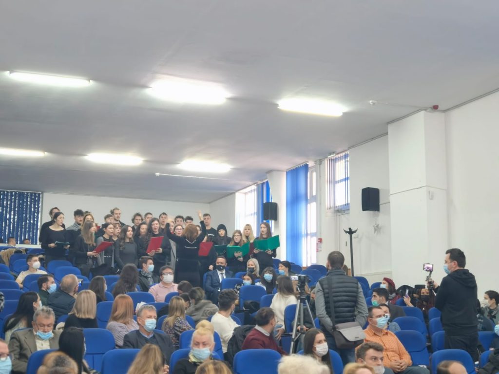 Corul Eutherpe al Liceului de Arte „Sabin Drăgoi” din Arad, condus de prof. Cristina Cameniţă, a încântat audienţa cu un colaj de colinde, iar filmuleţul de prezentare al sutelor de activităţi organizate în acest an a captivat atenţia invitaţilor la Gala Premiilor Academice 2021.