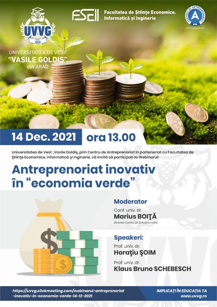 Universitatea de Vest „Vasile Goldiş” din Arad, prin Facultatea de Științe Economice, Informatică și Inginerie, ȋn parteneriat cu Centru de Antreprenoriat din cadrul Universităţii de Vest „Vasile Goldiş” din Arad, a organizat webinarul: „Antreprenoriat inovativ ȋn economia verde”. Evenimentul s-a adresat oamenilor de știință, cercetătorilor, economiştilor și antreprenorilor cu reputație naţională şi internațională, care au schimbat idei și au împărtășit o parte din experiența lor, dar și rezultatele cercetării în mai multe domenii ale antreprenoriatului, precum și aplicațiile lor în domeniul științei și tehnologiei.