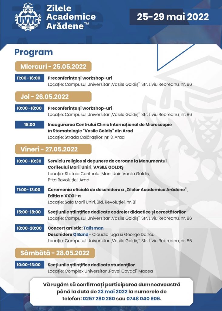 Zilele de miercuri, 25 mai şi joi, 26 mai sunt dedicate unor preconferinţe şi workshop-uri găzduite de Campusul Universitar de pe strada Liviu Rebreanu nr. 86. Tot joi, de la ora 18, are loc Inaugurarea Centrului Clinic Internaţional de Microscopie în Stomatologie „Vasile Goldiş” din Arad, situat pe strada Călăraşilor nr. 3. Conform programului manifestărilor, ziua de vineri, 27 mai începe la ora 10, cu un serviciu religios şi depunere de coroane la Monumentul Corifeului Marii Uniri, Vasile Goldiş, din Piaţa Revoluţiei. De la ora 11 are loc ceremonia oficială de deschidere a Zilelor Academice Arădene, ediţia XXXII, în Sala Marii Uniri situată pe Bdul Revoluţiei nr. 81. Programul va continua cu secţiunile ştiinţifice dedicate cadrelor didactice şi cercetătorilor, pentru ca de la ora 18, în Campusul Universitar, să aibă loc un concert susţinut de formaţia Talisman, în deschidere cântând Q Band – Claudia Iuga şi George Dancu. Sâmbătă, 28 mai, în Campusul Universitar „Pavel Covaci” din Macea are loc secţiunea ştiinţifică dedicată studenţilor UVVG.