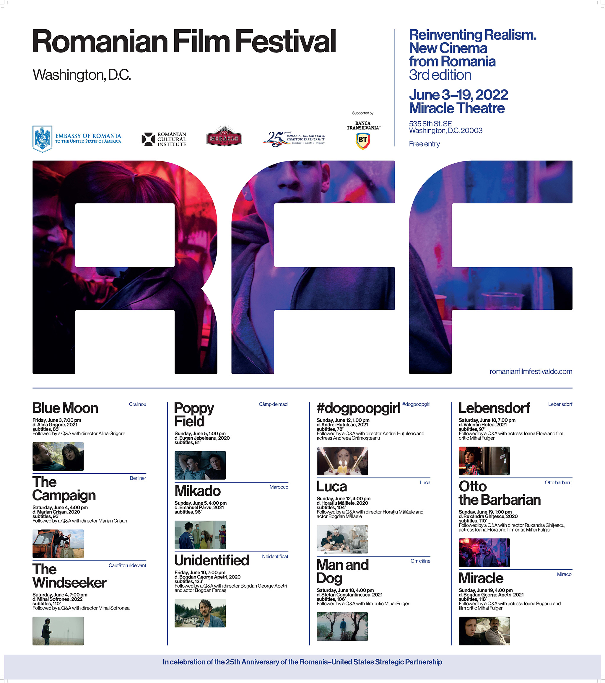 Cea de-a treia ediție a Festivalului de Film Românesc de la Washington, cel mai mare eveniment de promovare a cinematografiei naționale derulat în spațiul nord-american, debutează vineri, 3 iunie 2022, la Miracle Theatre, unul dintre cinematografele istorice din capitala americană. În acest an, festivalul este dedicat sărbătoririi a 25 de ani de la lansarea Parteneriatului Strategic dintre România și Statele Unite, important reper ale relațiilor bilaterale dintre cele două țări.
